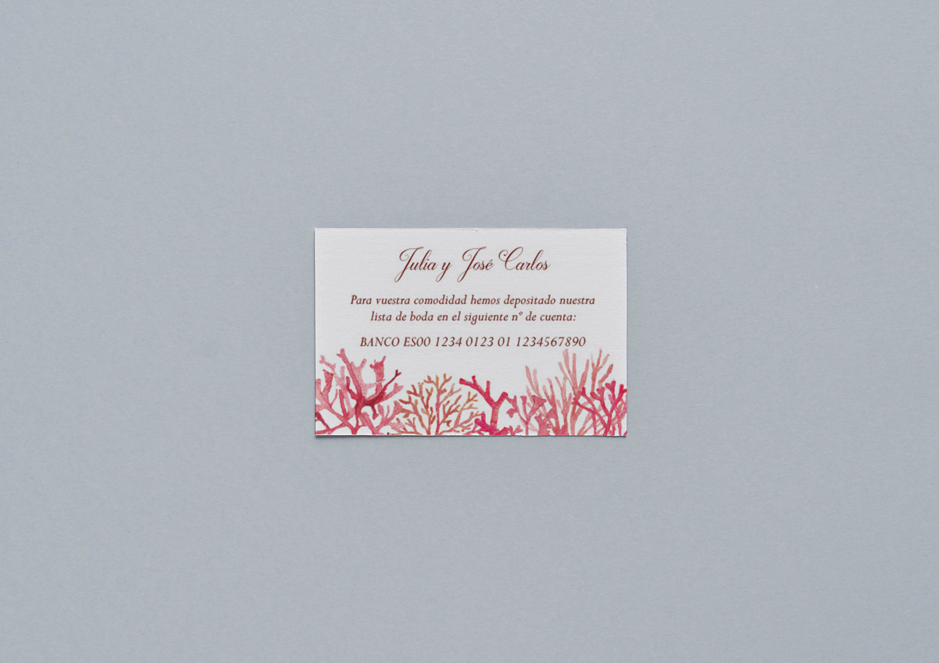 Tarjeta con lista de bodas tamaño 6x9cm de papel verjurado 220 gr color blanco roto o marfil. Posibilidad de elegir tipografía y color de tinta.